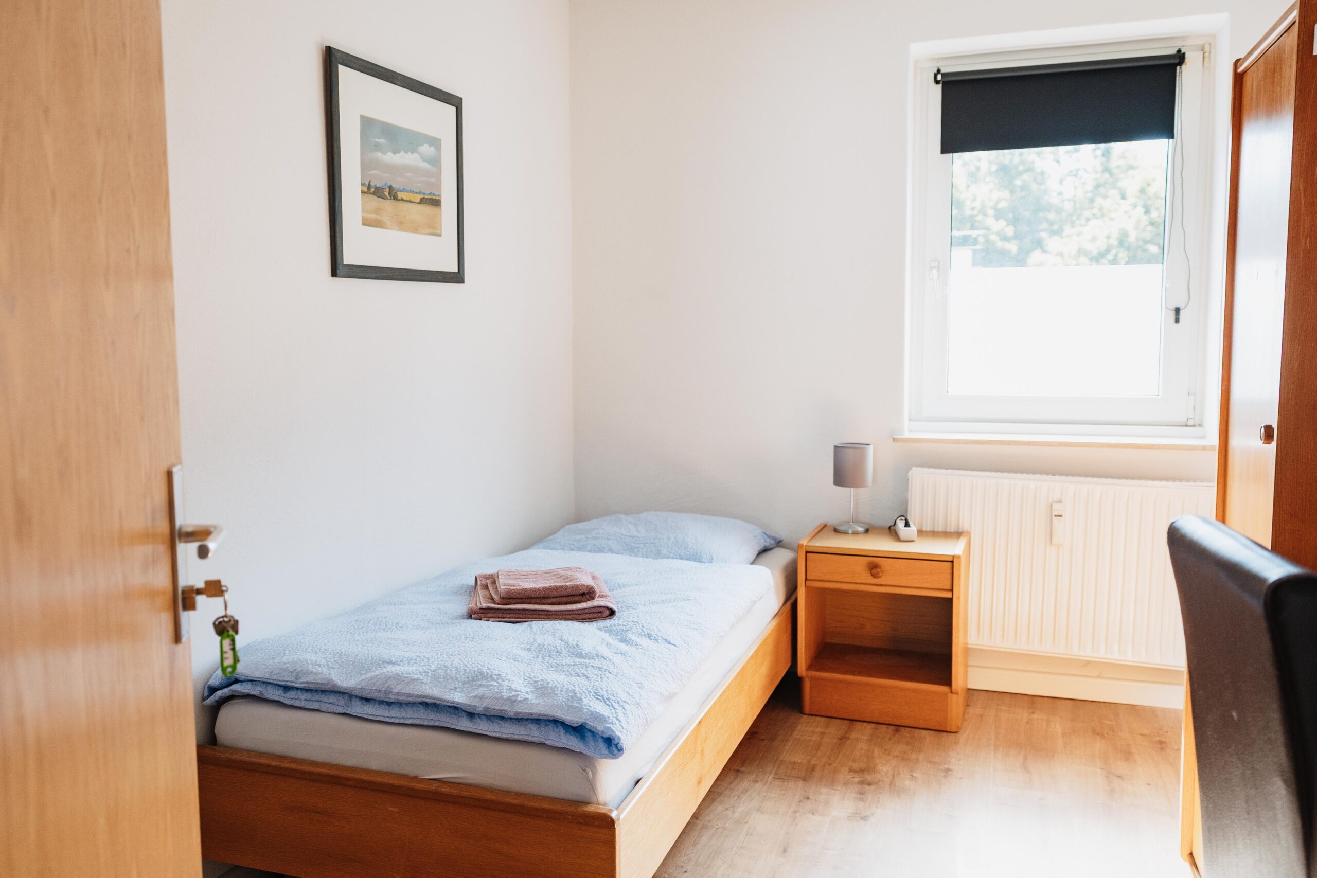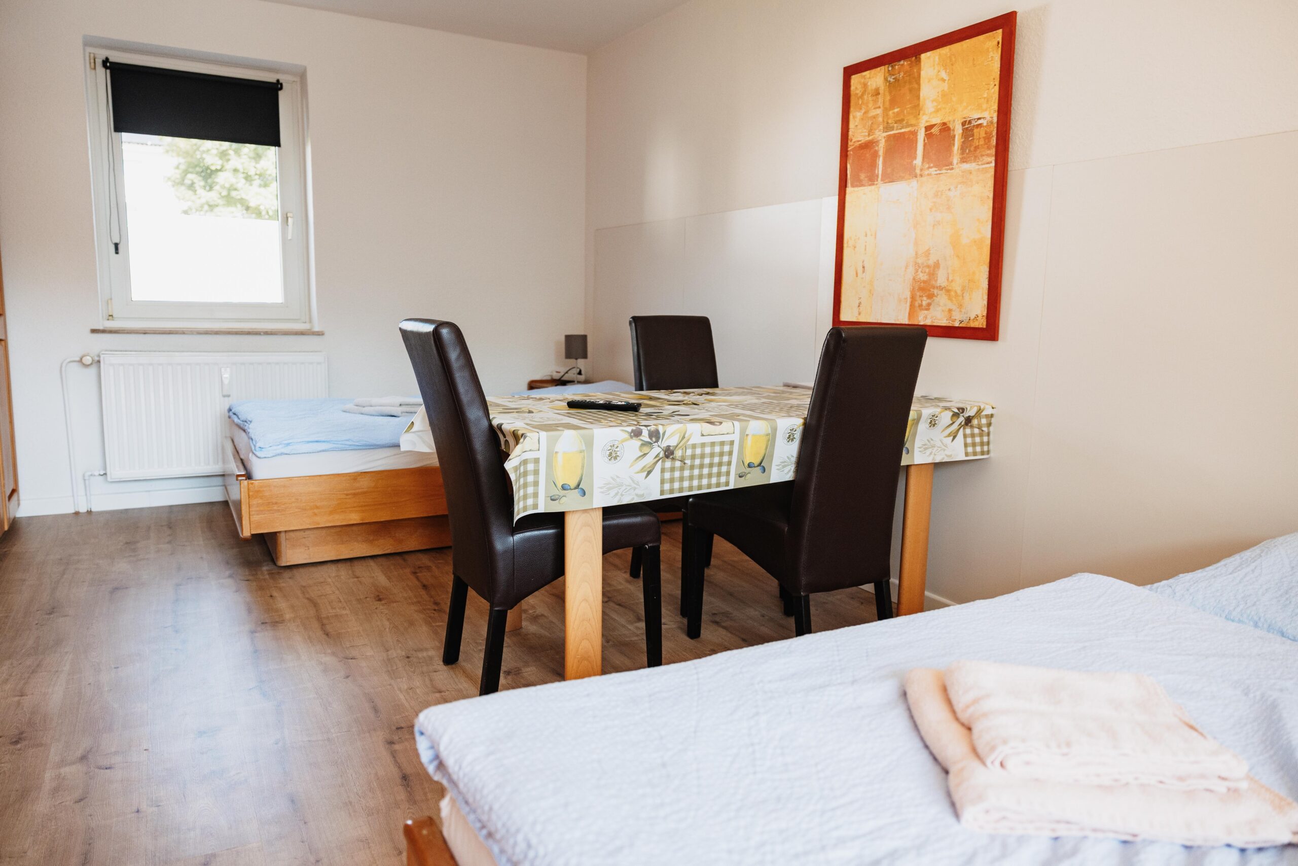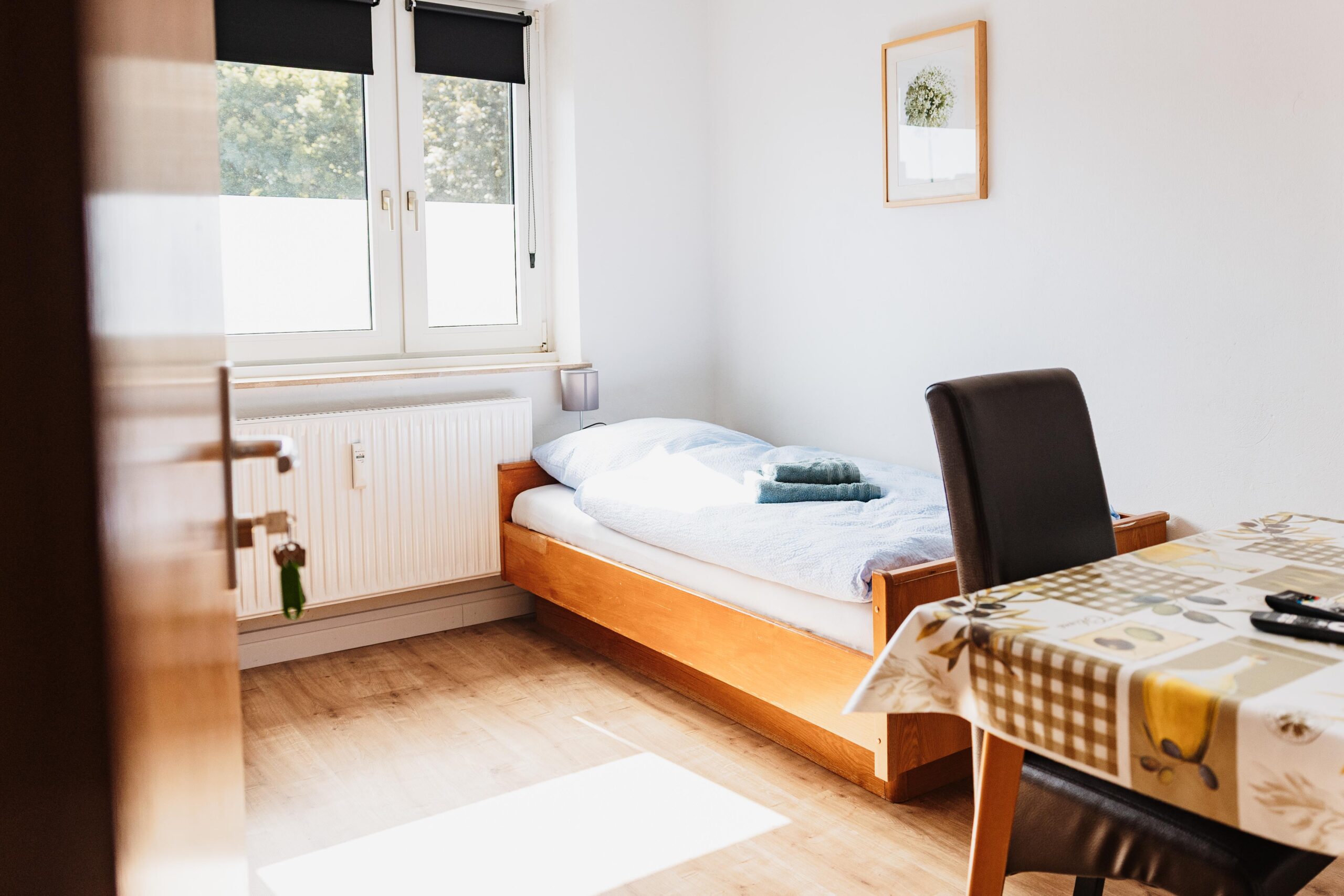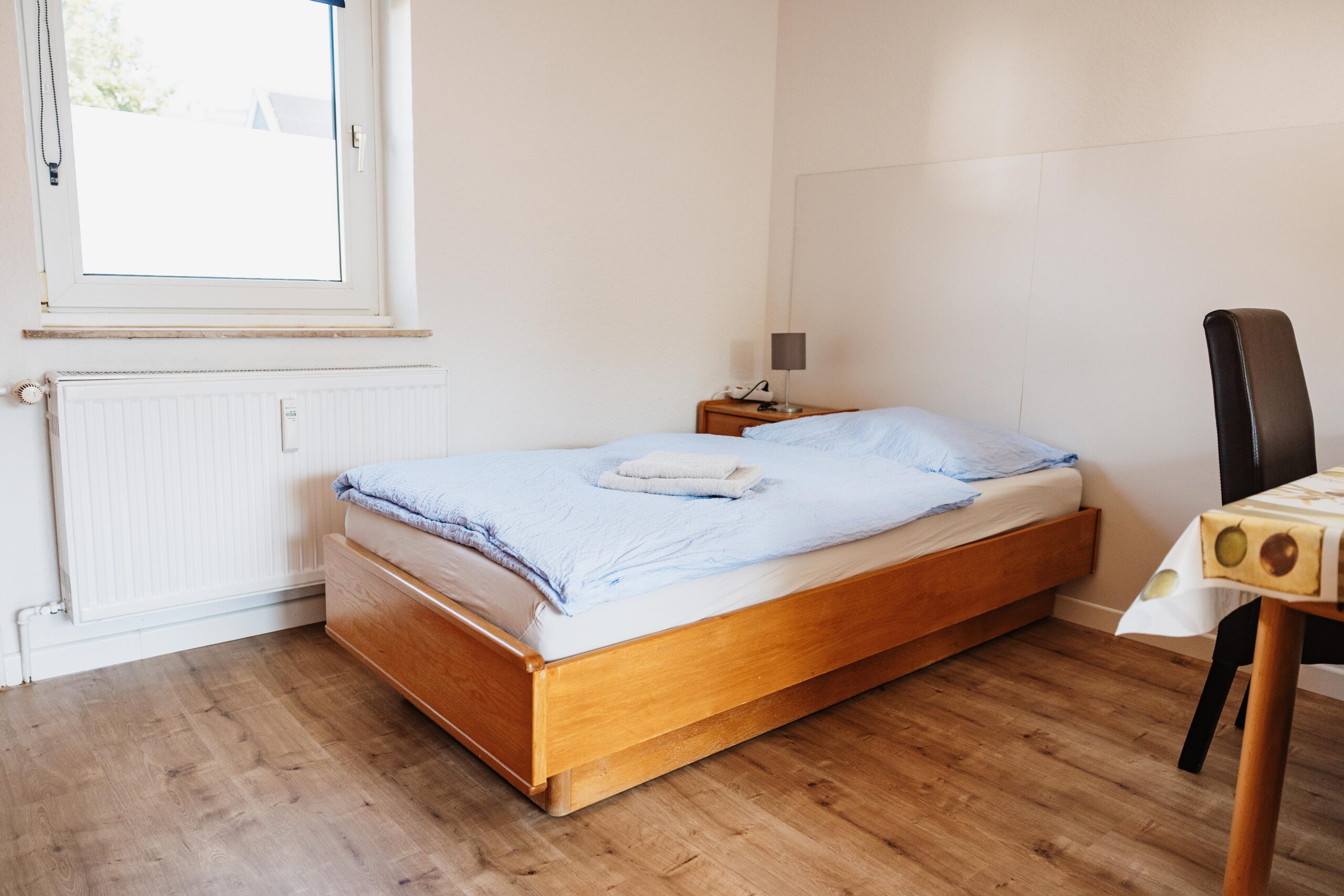 El piso de 72 m² para instaladores en Brilon ofrece espacio para hasta 5 personas. Está situado en la 1ª planta y dispone de dos habitaciones dobles con camas individuales y una habitación individual, ideal para grupos o compañeros que viajan juntos.