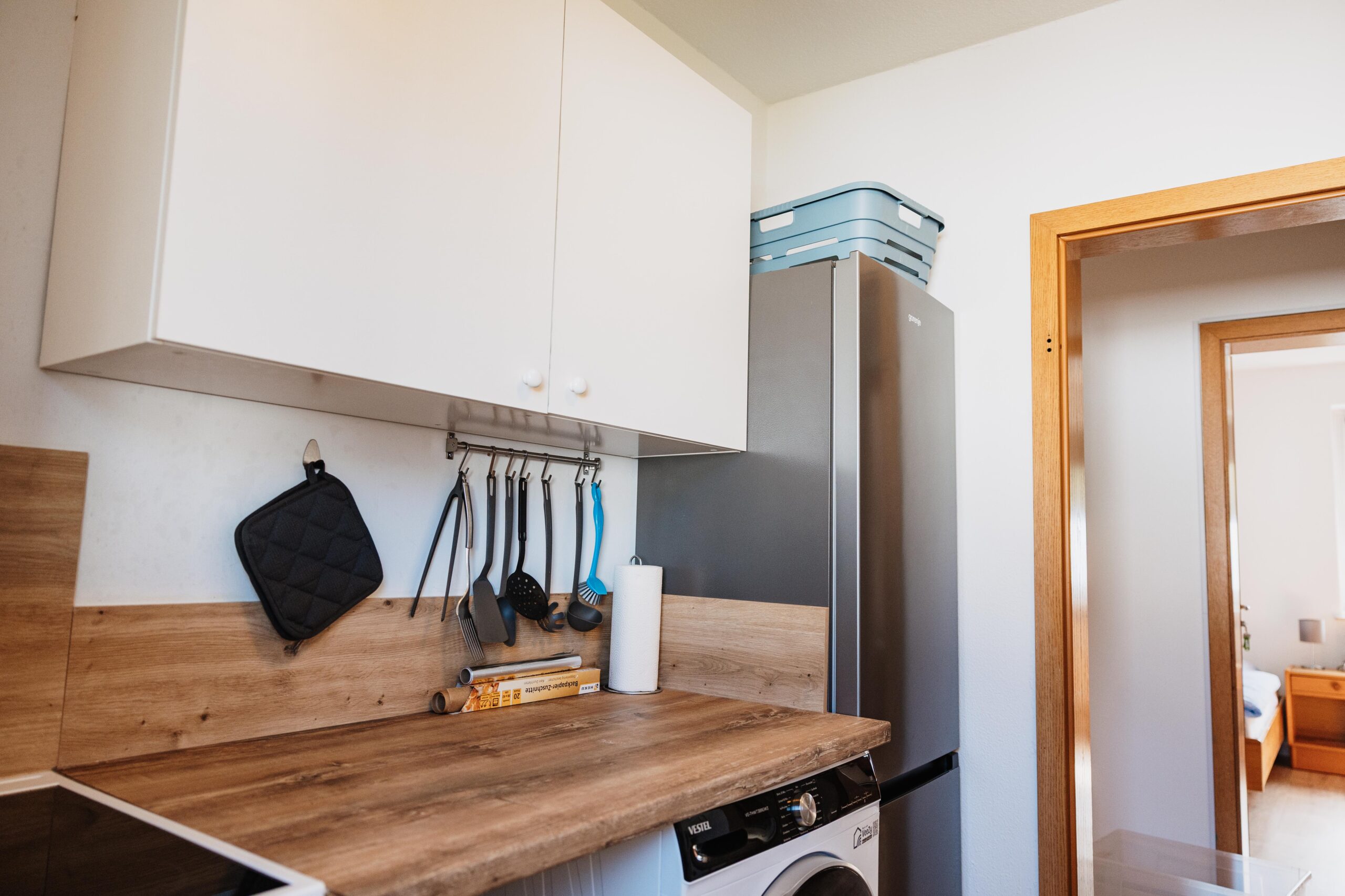 El piso tiene un cuarto de baño compartido con ducha, lavabo y WC. En la cocina totalmente equipada encontrará todo lo necesario para cocinar, placa eléctrica con horno, lavavajillas, frigorífico, congelador, microondas, cafetera, hervidor de agua, tostadora y todos los utensilios de cocina importantes.